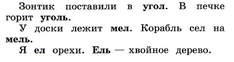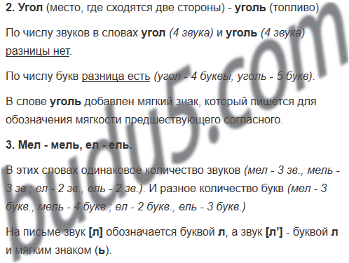2. Сравни выделенные слова. Что обозначают слова угол, уголь? Есть ли разница по числу звуков в словах угол и уголь? А по числу букв? Почему во втором слове на одну букву больше? Что это за буква? Зачем она пишется?
