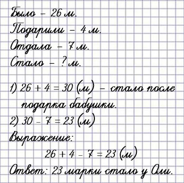 У Оли в коллекции было 26 марок. Бабушка подарила ей еще 4 марки. 7 марок Оля отдала брату. Сколько марок стало у Оли?