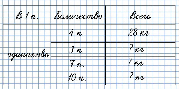 3. В 4 одинаковых по массе пакетах 28 кг вишни. Сколько килограммов вишни в 3 таких пакетах? в 7 пакетах? в 10 таких пакетах?