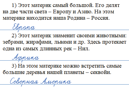1) Этот материк самый большой. Его делят на две части света – Европу и Азию. На этом материке находится наша Родина – Россия.