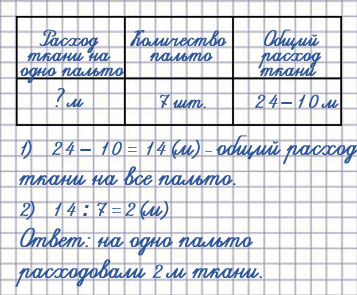 3. В куске было 24 м ткани. Из 10 м этой ткани сшили детские костюмы, а из остальной ткани — 7 одинаковых детских пальто. Сколько метров ткани расходовали на одно пальто?