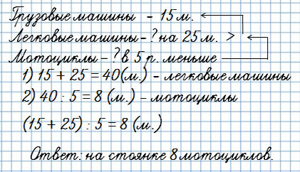 3. На стоянке было 15 грузовых машин, легковых на 25 машин больше, чем грузовых, а мотоциклов в 5 раз меньше, чем легковых машин. Сколько мотоциклов было на стоянке?